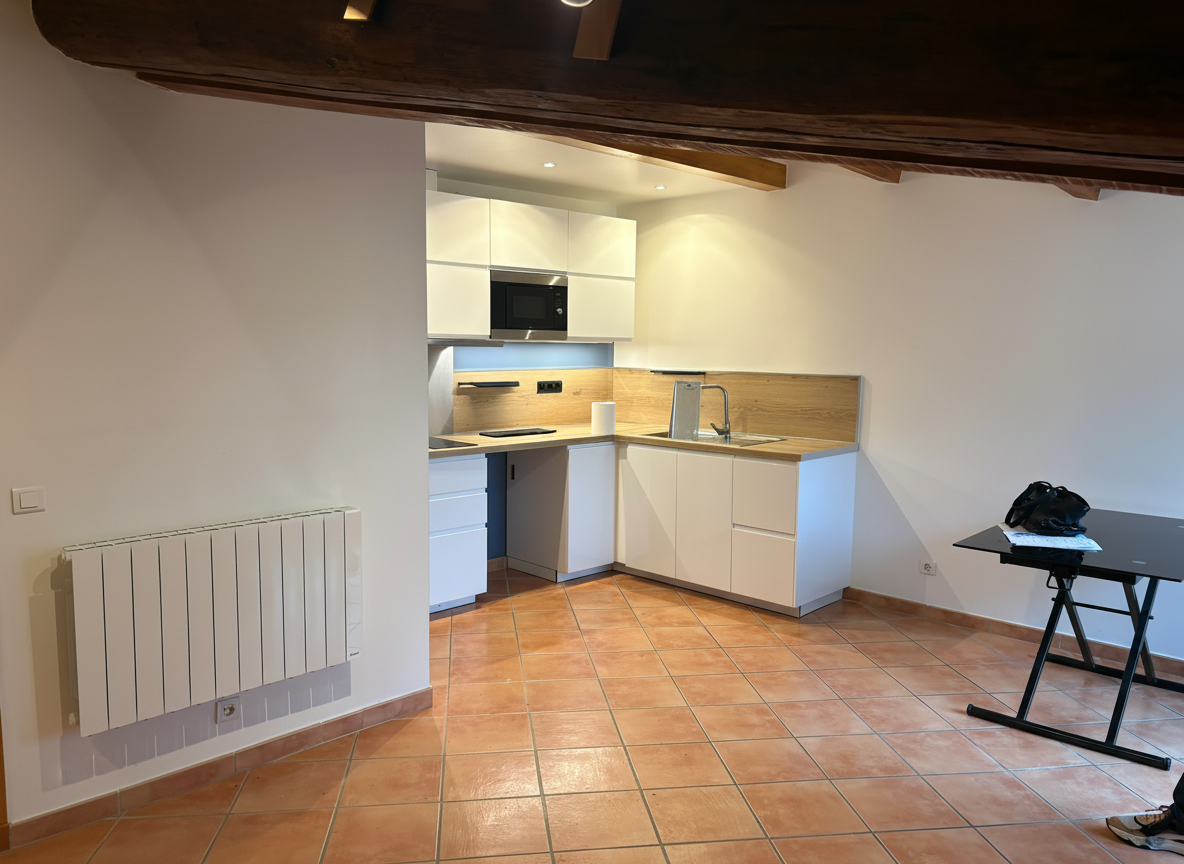 Il se compose d’une pièce de vie lumineuse avec cuisine ouverte (22,33 m²) donnant sur la terrasse, d’une petite chambre avec placard aménagé (9.45 m²) ainsi que d’une salle d’eau avec WC.
