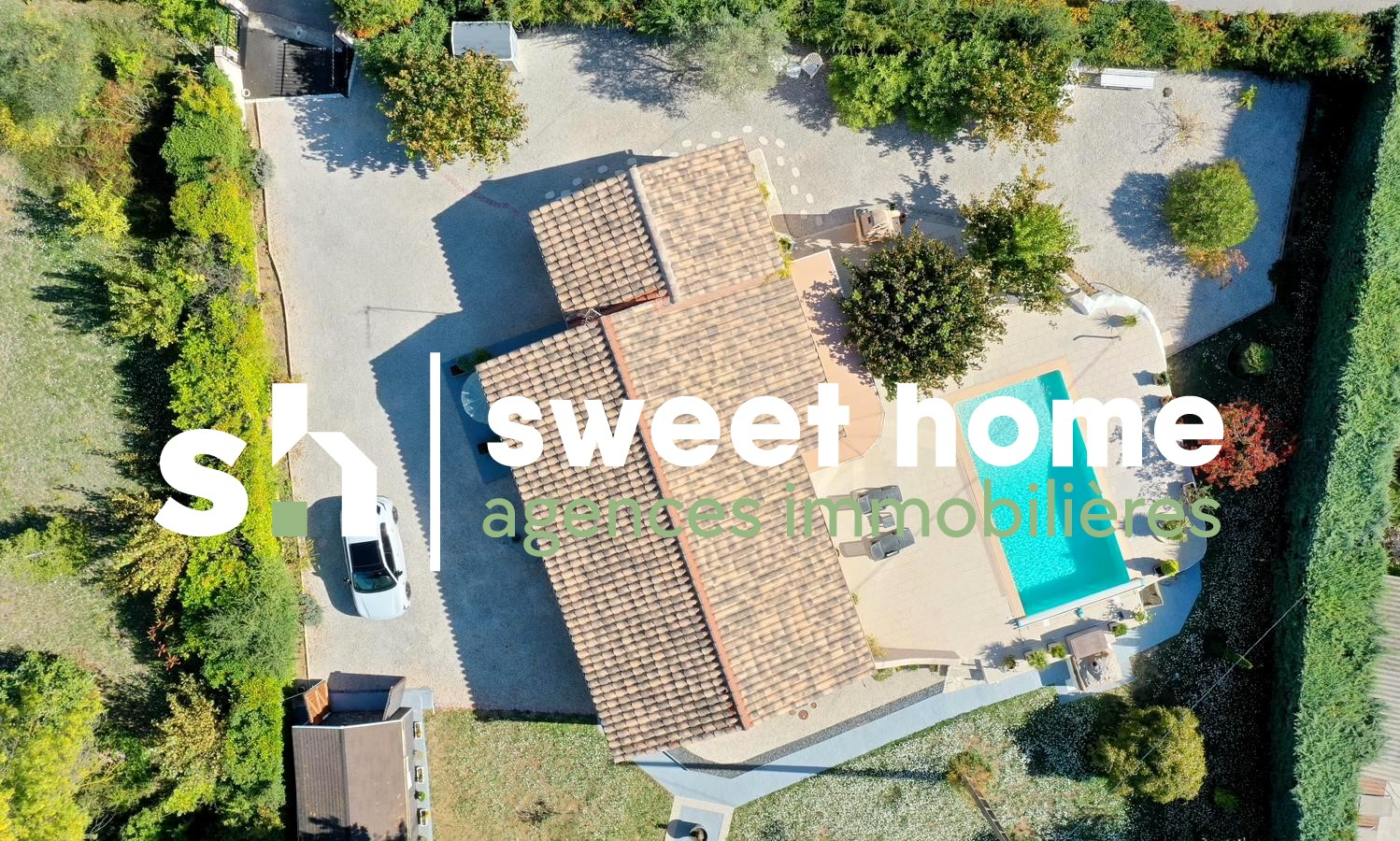 A vendre, en exclusivité avec vos agences SWEET HOME, sur la commune de ROCBARON, proche des commerces et accès facile : Jolie maison parfaitement entretenue de plain-pied d’environ 105 m² habitables et une véranda d’environ 20 m². Elle se compose , d’une entrée, un salon-séjour avec cuisine ouverte, une véranda, trois chambres et un bureau ou quatrième chambre, une salle de bains et une salle d’eau. Terrain plat d’environ 1200 m² en copropriété horizontale (2 lots seulement) avec piscine, garage ou atelier et chalet en bois de 17m² . Jardin avec très peu d’entretien, relié au TAE avec relevage, quartier recherché, calme et résidentiel.