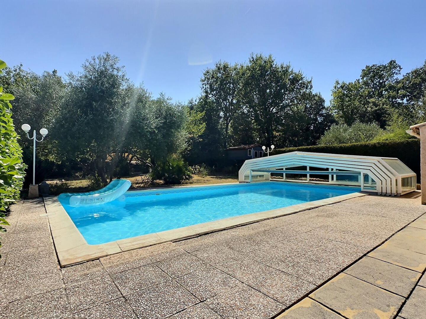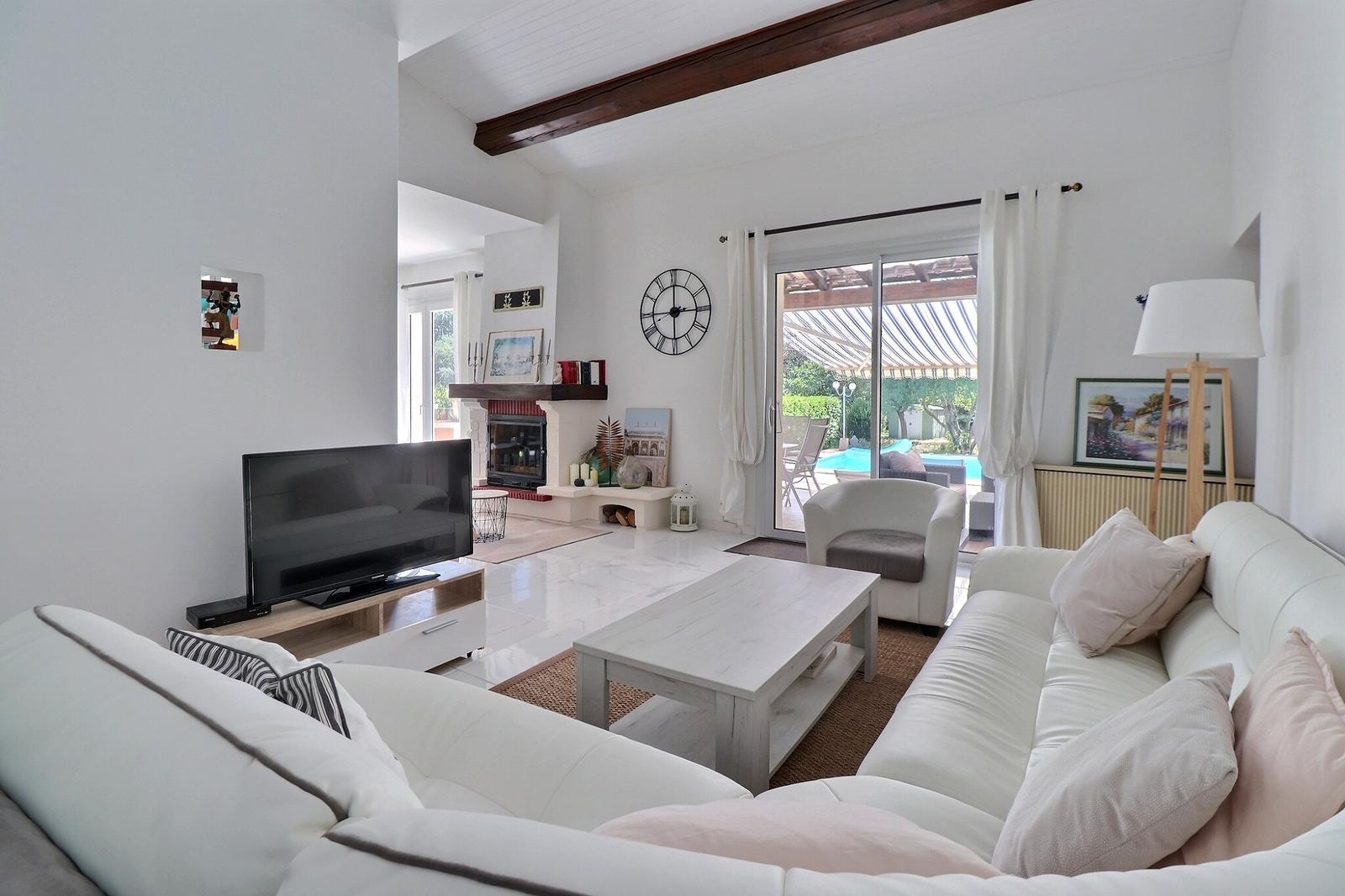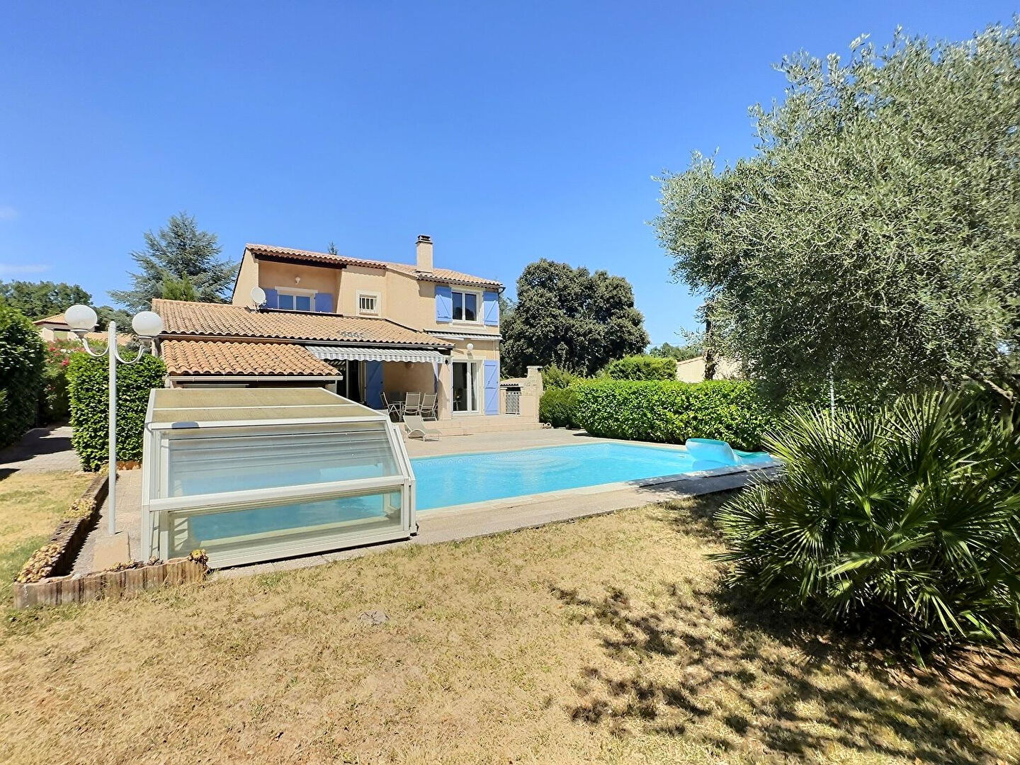 A vendre, en exclusivité avec vos agences Sweet Home, sur la commune de GAREOULT, dans un quartier résidentiel, au calme absolu, en impasse, édifiée sur un terrain clos et plat de 1198m², villa de construction traditionnelle de 127m² (loi carrez), en très bon état général, comprenant au rez-de-chaussée : une entrée, un espace de vie d’environ 60m² avec cuisine semi-ouverte, une buanderie, un wc, une chambre avec salle d’eau privative. A l’étage : trois chambres, une salle de bains, un wc. Garage attenant de 18m², terrasse, piscine 10×5 mètres avec dôme rigide, douche extérieure. A visiter sans tarder