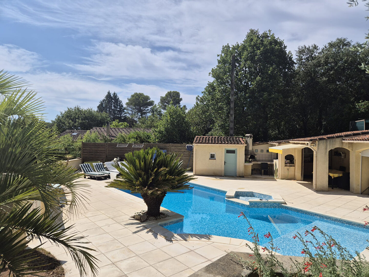 A l’extérieur, la propriété possède une cour avec double carport, un magnifique espace piscine chauffée traditionnelle 11 X 4 avec vaste plage, grand pool house aménagé (cuisine, barbecue, coin douche et WC, rangements), terrasse sud avec four a pain, terrain de pétanque, abri et nombreux arbres fruitiers.