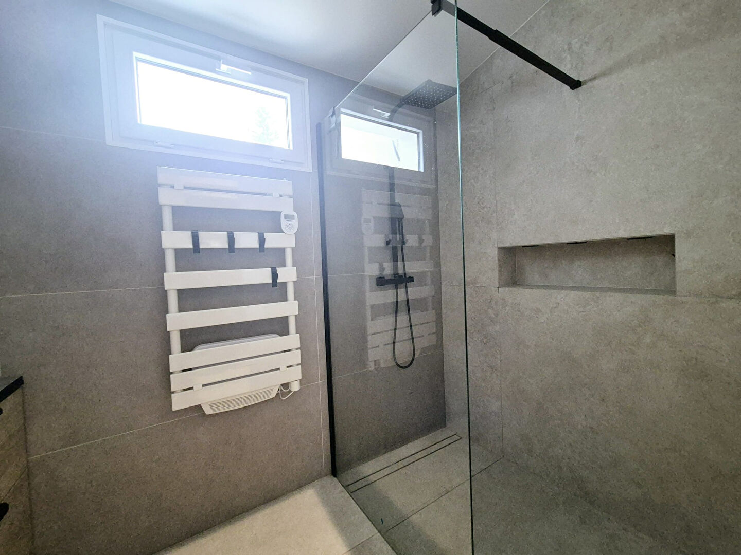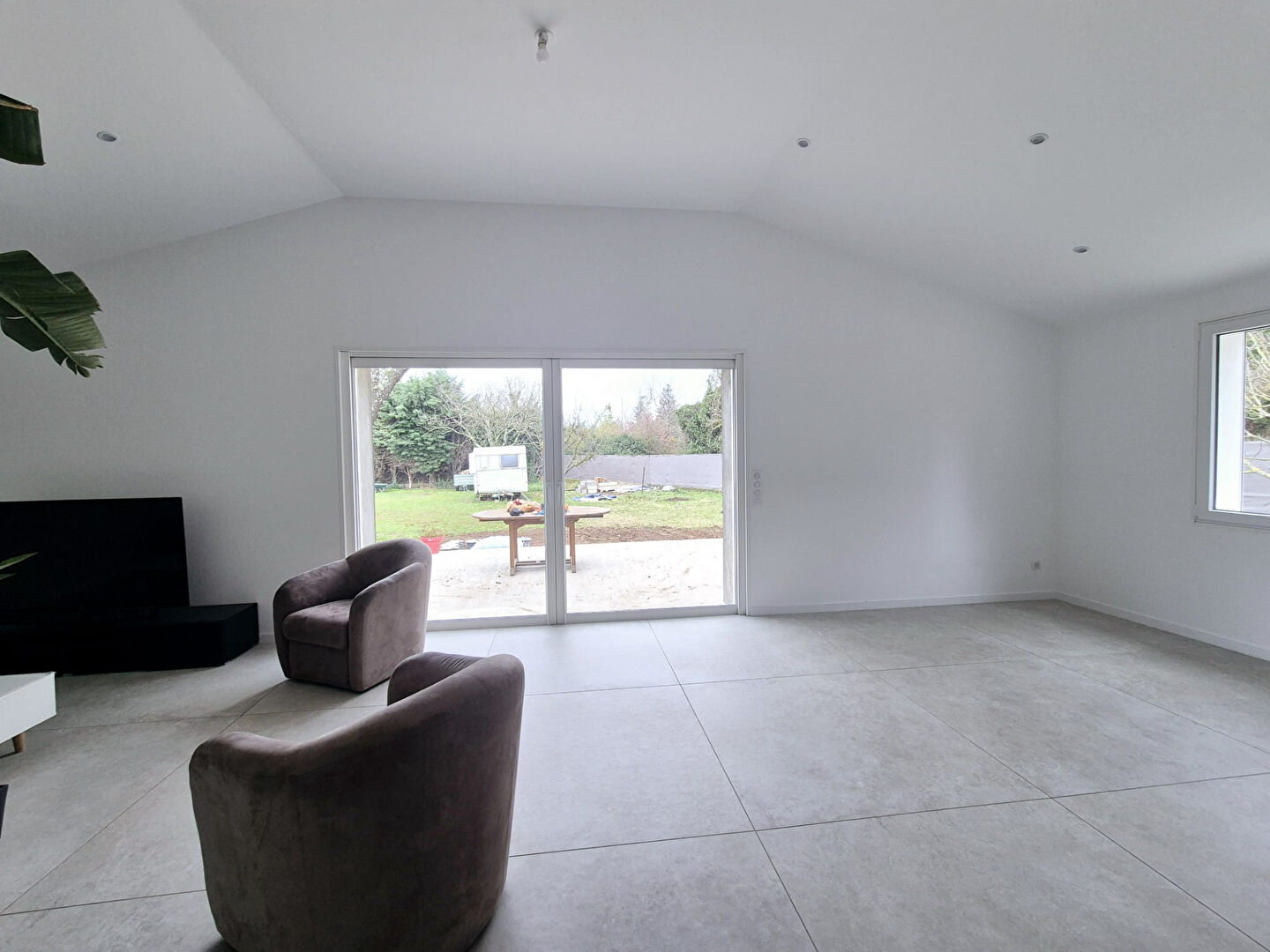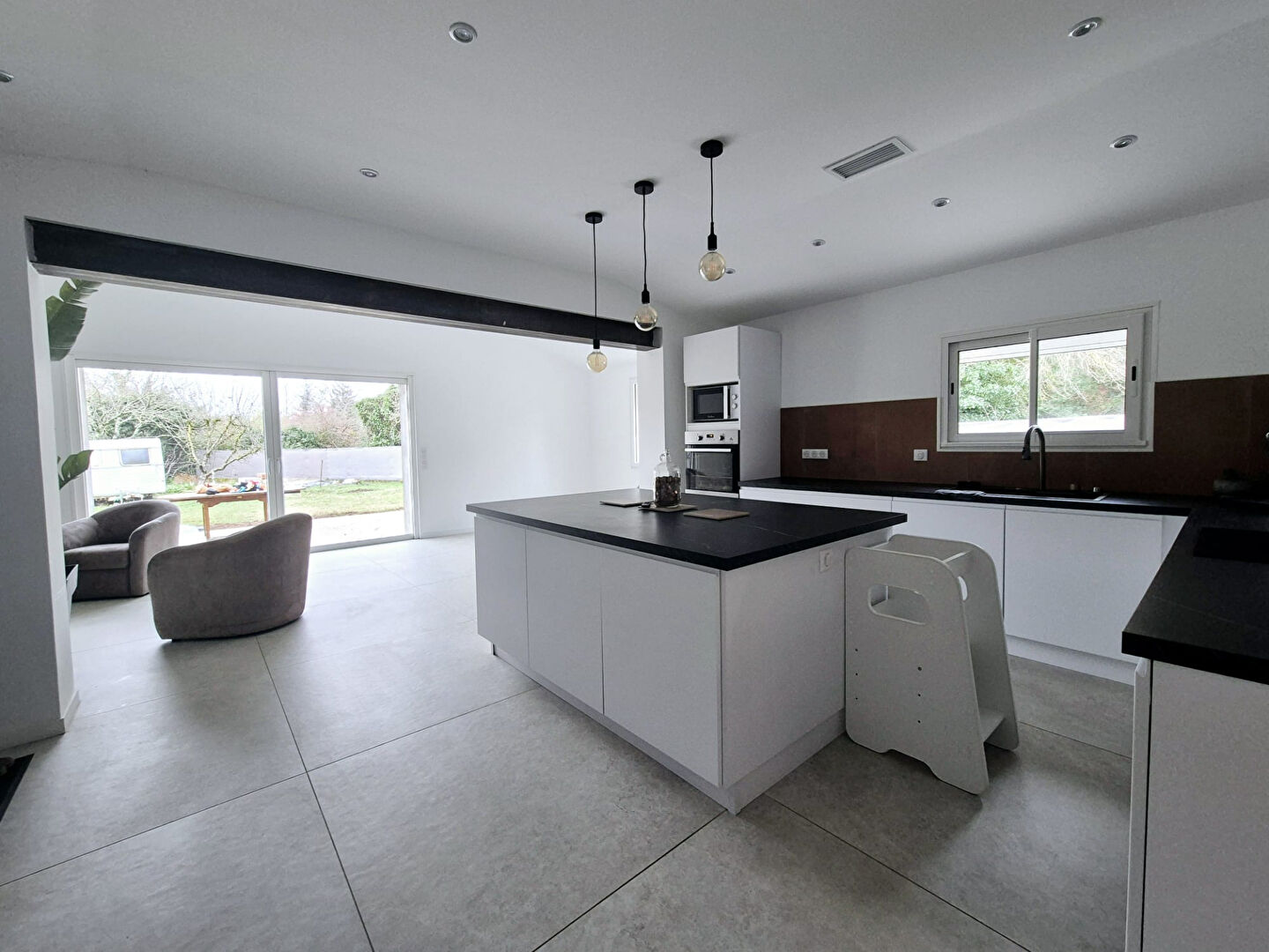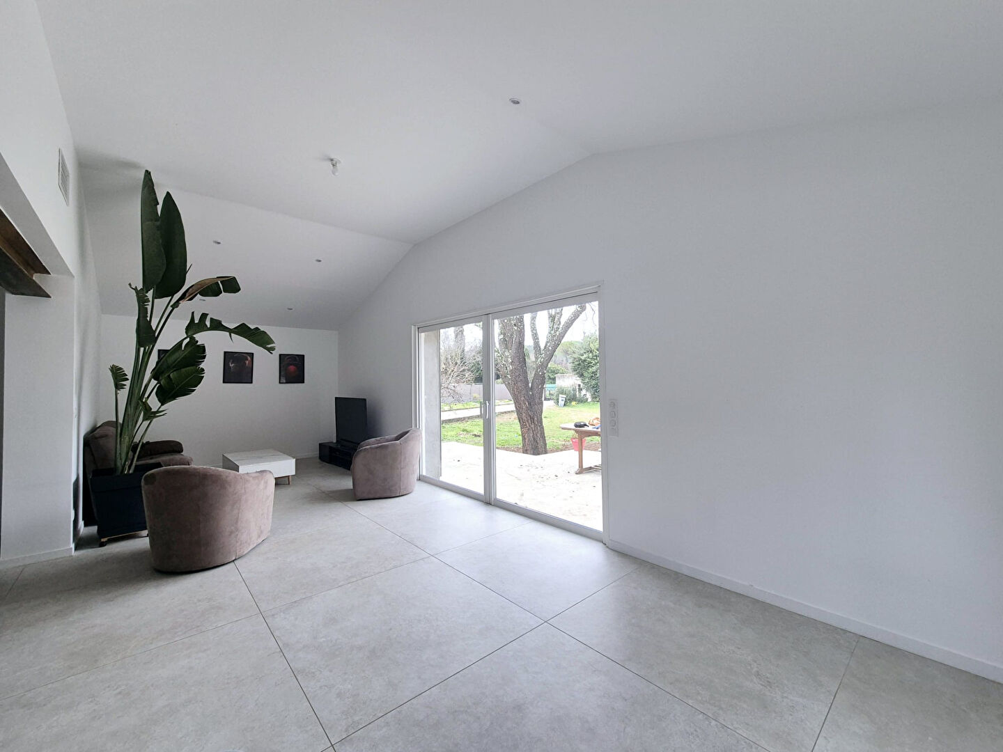 Côté extérieur, une terrasse plein sud sur terrain plat de 1500 m² entièrement clôturé.