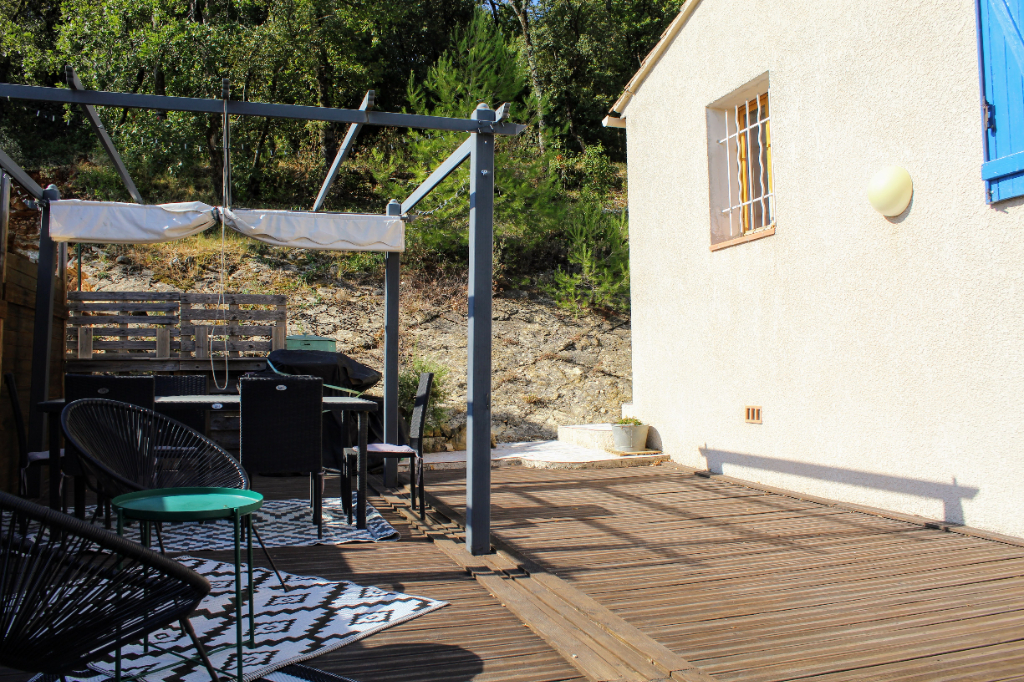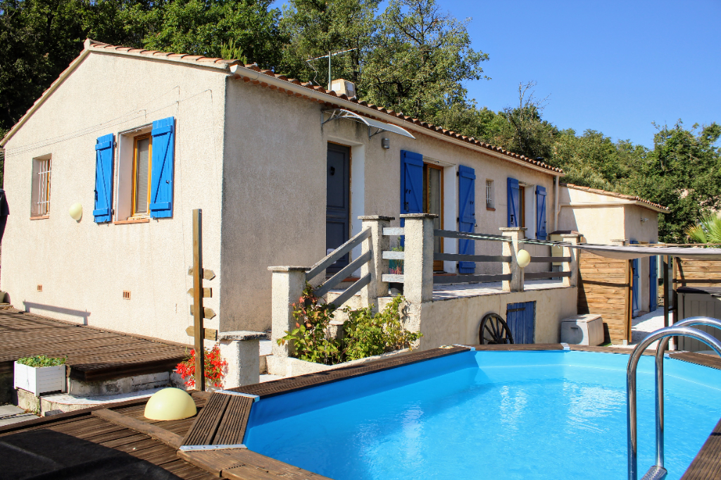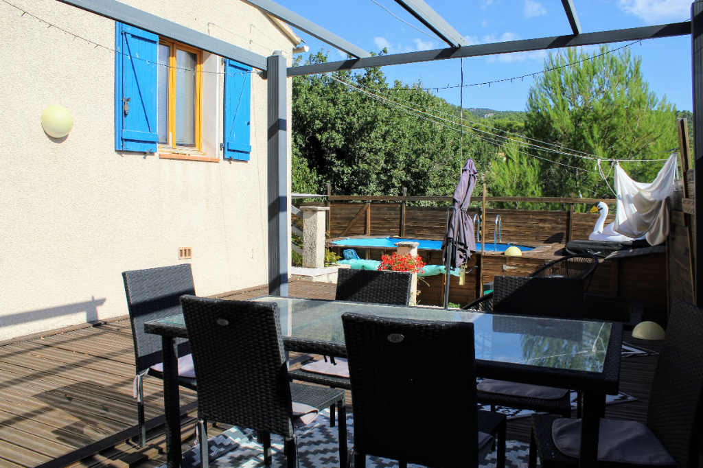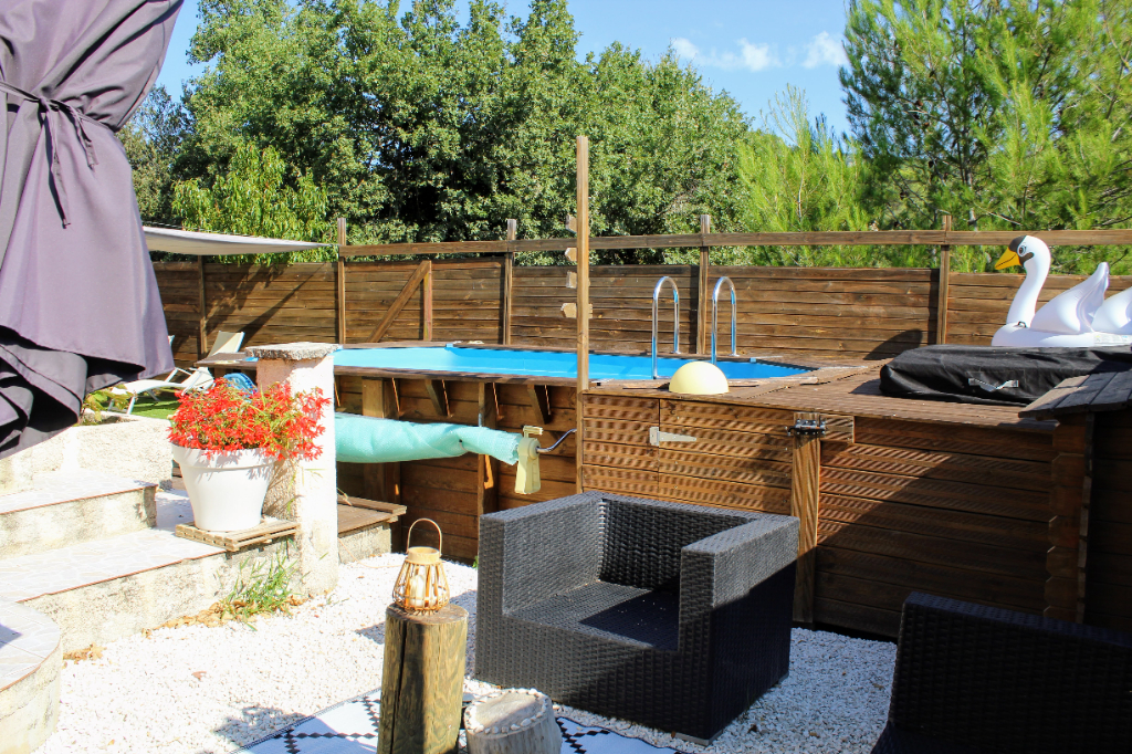 Jolie piscine hors sol, grande terrasse bois, chauffage central au pellet, tout à l’égout.