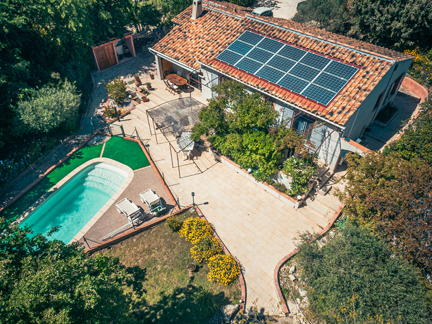 Climatisation réversible, panneaux photovoltaïque avec revenu d’environ 1800 euros/an, terrasse, piscine 7×3, , appentis, chalet 14 m² sur dalle béton, pergolas.