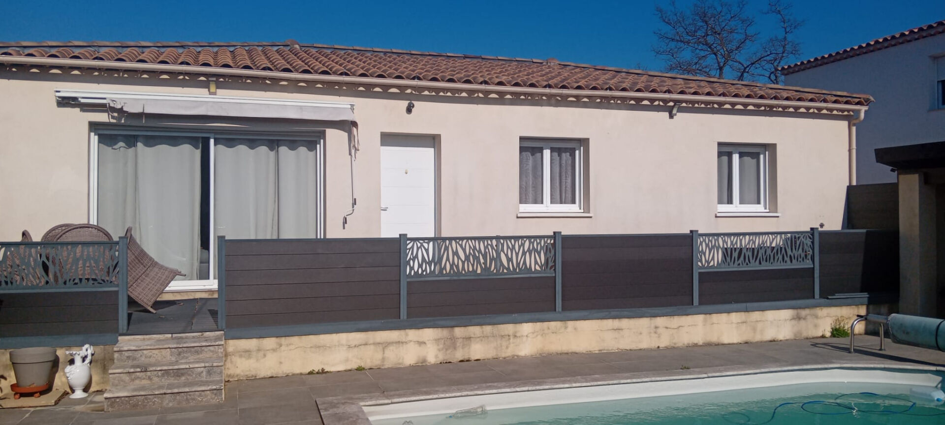 Une terrasse avec piscine et pool housse au sud ainsi qu’une terrasse en partie couverte avec espace jacuzzi viennent compléter ce bien.