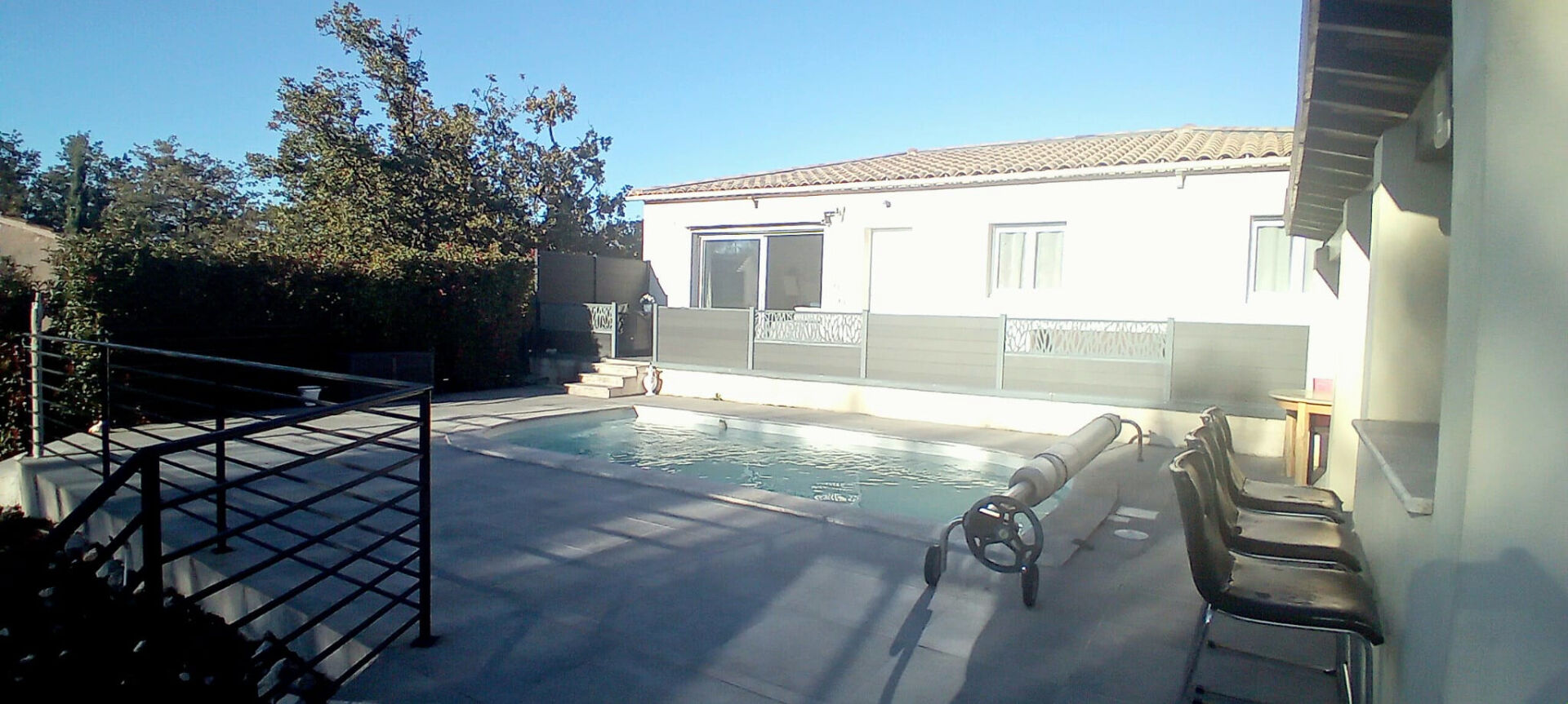 Une terrasse avec piscine et pool housse au sud ainsi qu’une terrasse en partie couverte avec espace jacuzzi viennent compléter ce bien. Vous pouvez stationner aisément trois véhicules sur la parcelle.