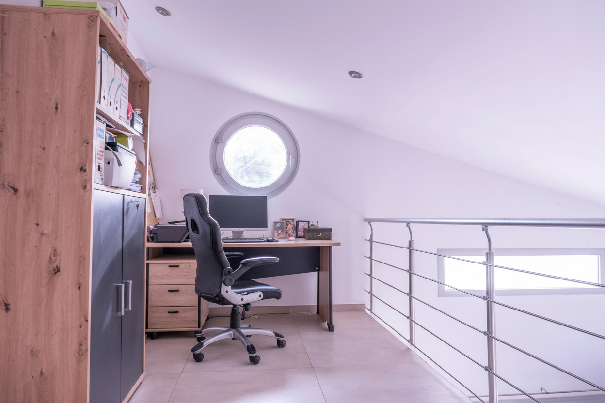 A l’étage, un large dégagement aménagé en coin bureau et espace de jeux dessert une confortable suite parentale avec salle d’eau, dressing et accès à un balcon offrant une vue imprenable.